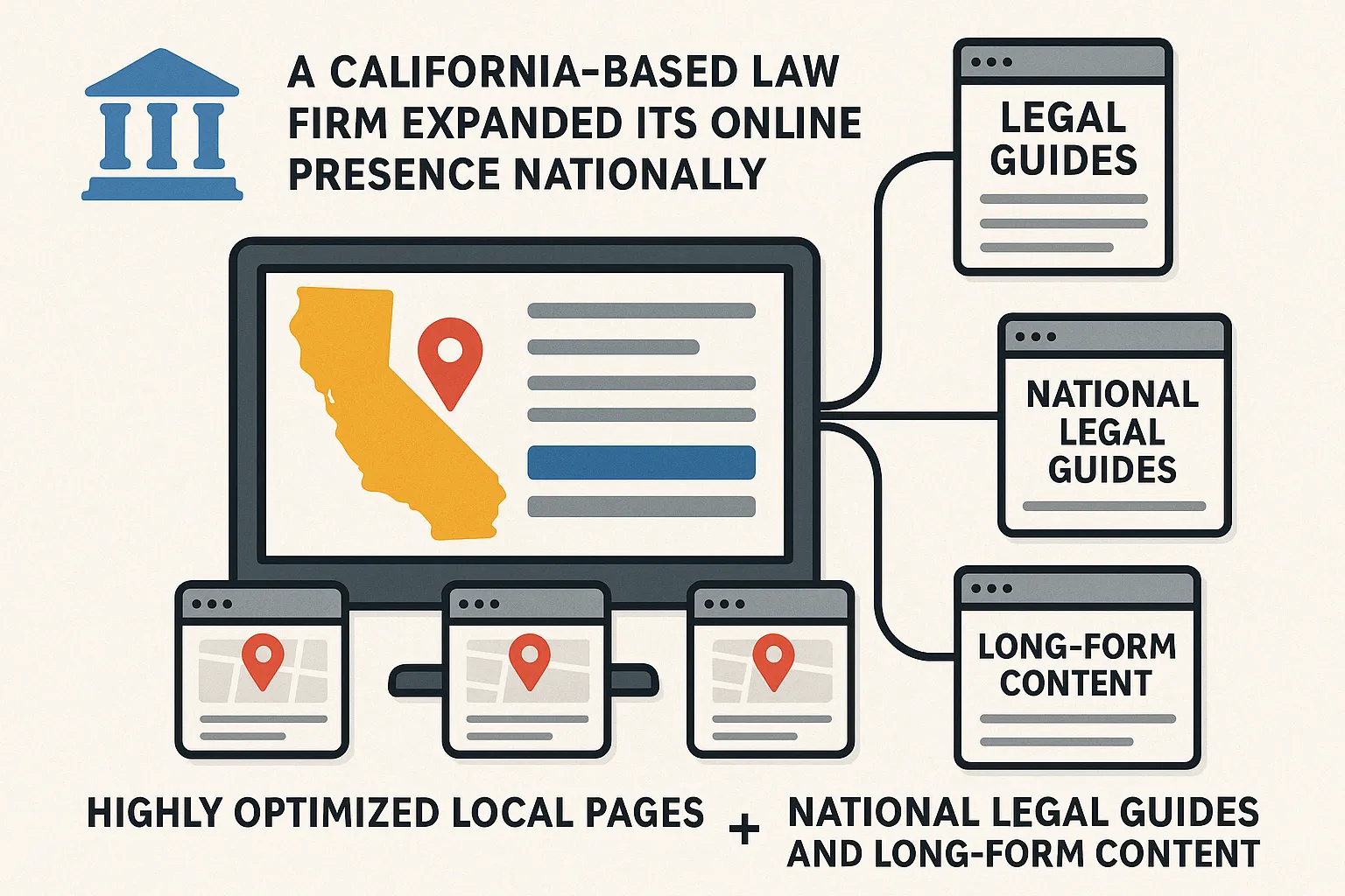 Example: A California-based law firm expanded its online presence nationally by using highly optimized local pages, then layering on national legal guides and long-form content to expand reach.